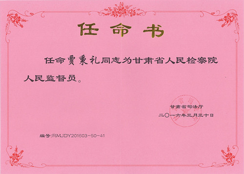 贾秉礼律师2016年度被甘肃省司法厅任命为甘肃省人民检察院人民监督员