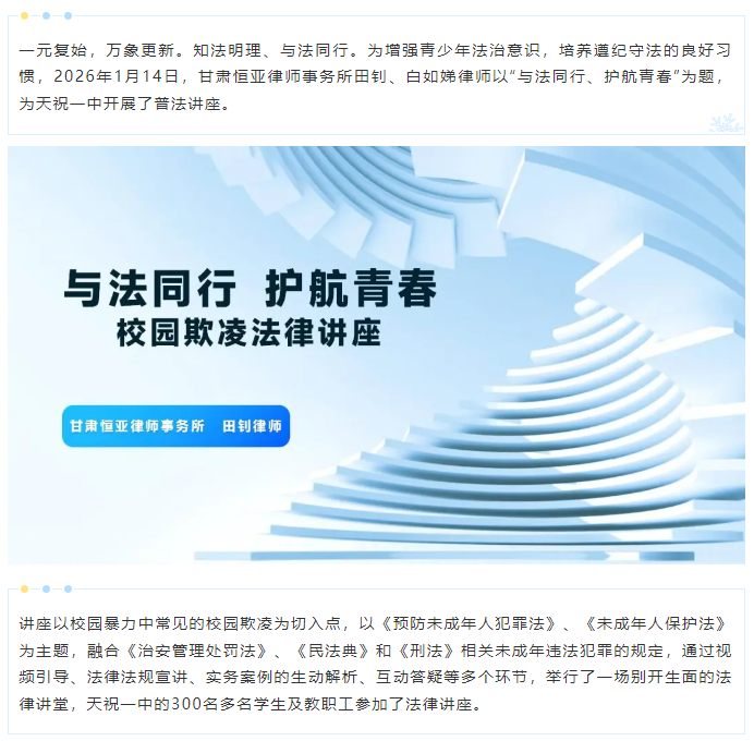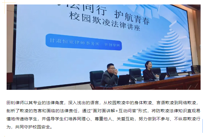 本所田钊、白如娣律师受邀为天祝藏族自治县第一中学开展“与法同行、护航青春”法律讲座!